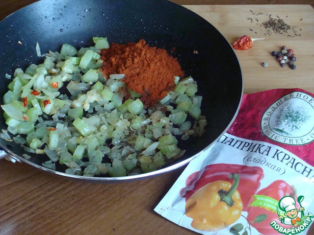 Добавьте 1 ст. л. сладкой паприки, половинку перца чили (у меня был маленький засушенный), щепотку зиры, перец горошком (раздавить).