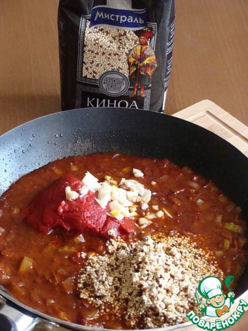 В это время тщательно промываем киноа (если промыть плохо - может горчить!) и добавляем ее на сковороду.