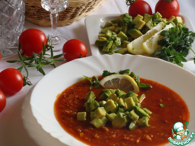 Готовый суп наливаем в тарелку и сверху выкладываем авокадо.