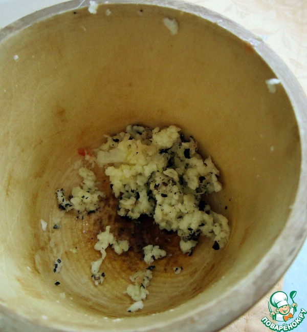 Перец растереть, чеснок через чеснокодавку, перемешать чеснок и перец.