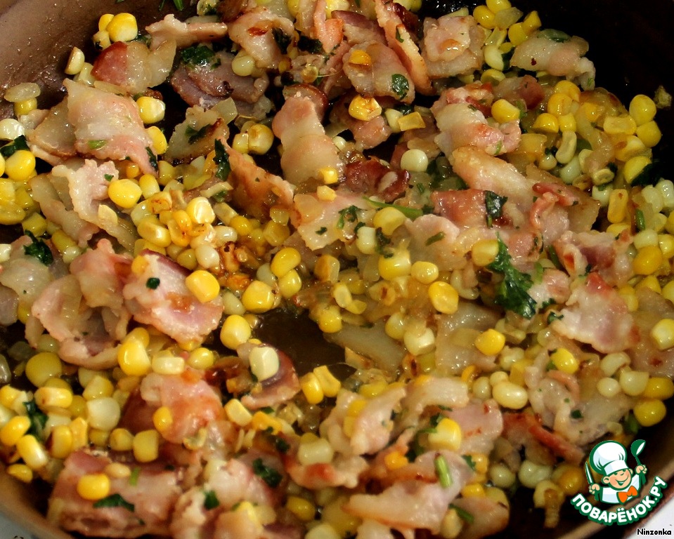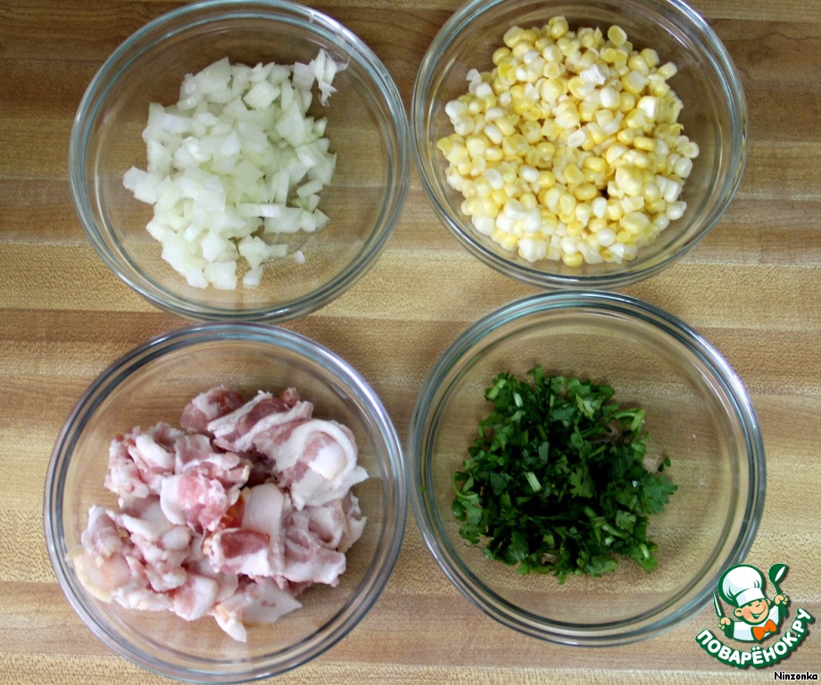 Теперь готовим начинку. Лук и петрушку мелко нарезаем, бекон режем на маленькие куски, с кукурузы срезаем зерна.