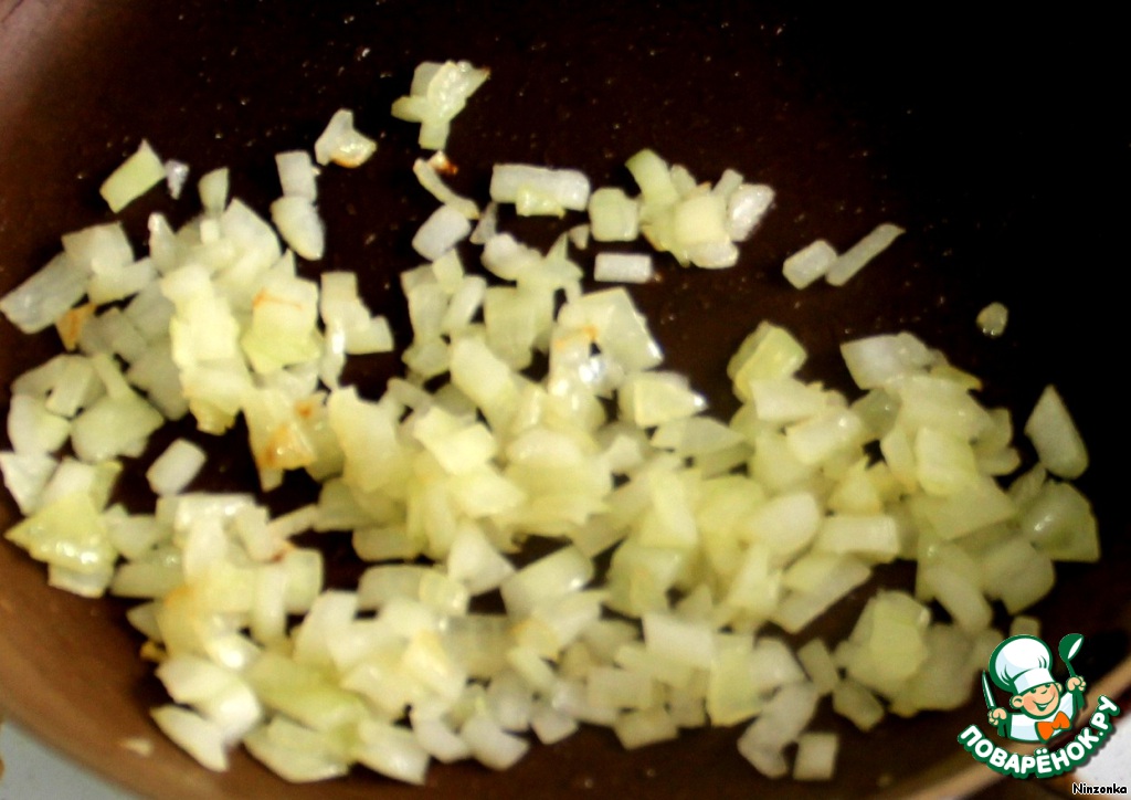 На нагретую сковороду наливаем оливковое масло и слегка обжериваем в нем лук.