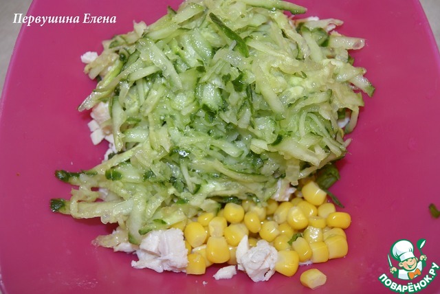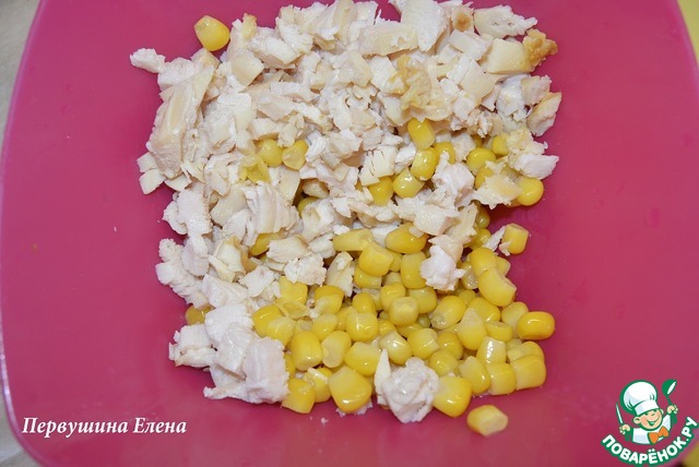 Копченый окорочок нарезать кубиками (шкурка не нужна). Открыть баночку кукурузы, слить сок.