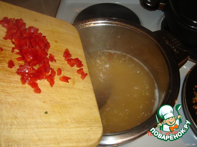Перец мелко покрошить и бросить в бульон с горохом.