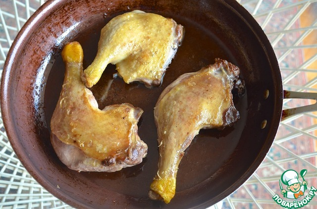 1. Обрезать весь лишний жир с утиных ног и обжарить их с обеих сторон, чтобы они приобрели золотистый цвет. Убрать утку из сковороды и отложить. Вылить почти весь оставшийся жир из сковороды, оставив немного на дне.
