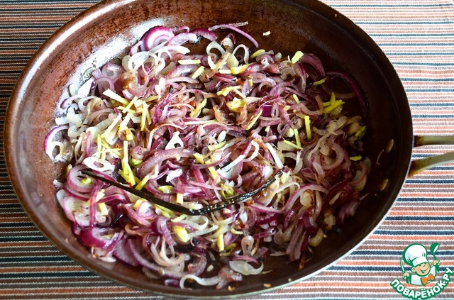 3. Лук порезать тонкими полукольцами и добавить в сковороду вместе с измельченными специями и разрезанным вдоль стручком ванили. Готовить на медленном огне, чтобы лук карамелизировался, помешивая, примерно 5 минут, затем добавить порезанный тонкой соломкой имбирь и порезанный на тонкие пластины чеснок. Протушить все еще 2 минуты. Выложить луковую смесь в кастрюлю с толстым дном, туда же положить обжаренные утиные ноги, залить водой, довести до кипения, снизить температуру до минимума и тушить 45 минут.