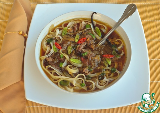 5. Выложить суп в тарелки, добавить готовую лапшу, посыпать тонко порезанным зеленым луком, очень тоненькими кружочками перца-чили и листьями мяты и подавать горячим.