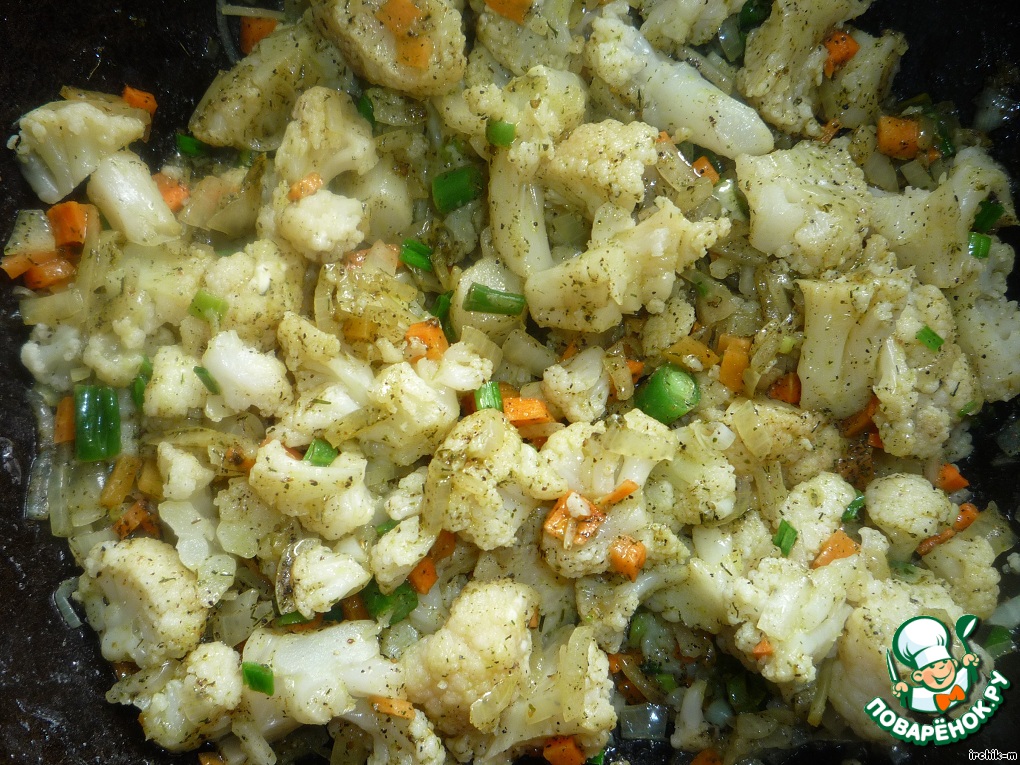 Как только овощи слегка подрумянятся, бросайте цветную капусту, черный молотый перец, укроп, хмели-сунели, соль по вкусу.