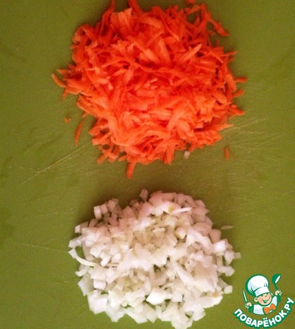 Пока вариться мясо, нарезаем мелко оставшуюся половину луковицы, морковь натираем на терке