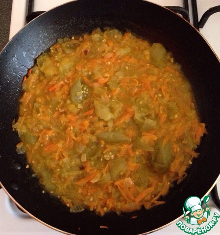 Обжариваем лук и морковь на сковороде, добавляем маринованные помидоры, тушим 5 минут.