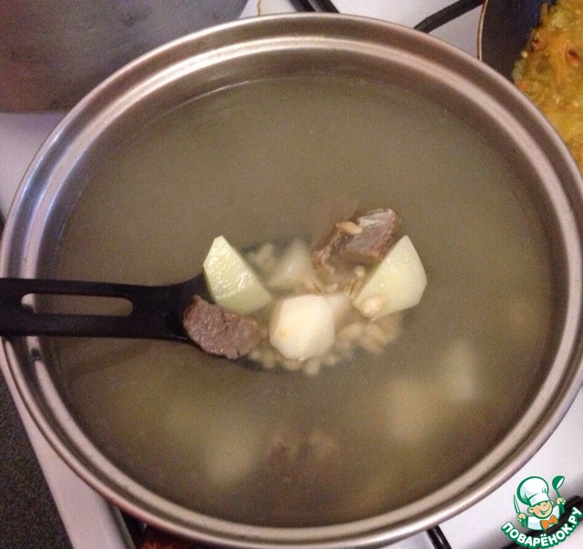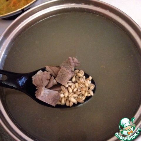 В кастрюлю добавляем нарезанное мясо и перловку. Варим на медленном огне 20 минут.