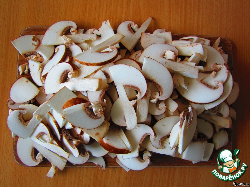 Шампиньоны нарезаем как вашей душе угодно, моей было угодно нарезать на тонкие пластинки.