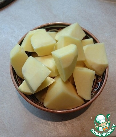Картофель режем на четыре части и в месте с пшеном отправляем в бульон, выставляем низкое давление на десять минут.
