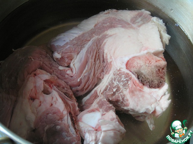 Свинину хорошо промыть, положить в кастрюлю (4л), залить холодной водой, довести до кипения.