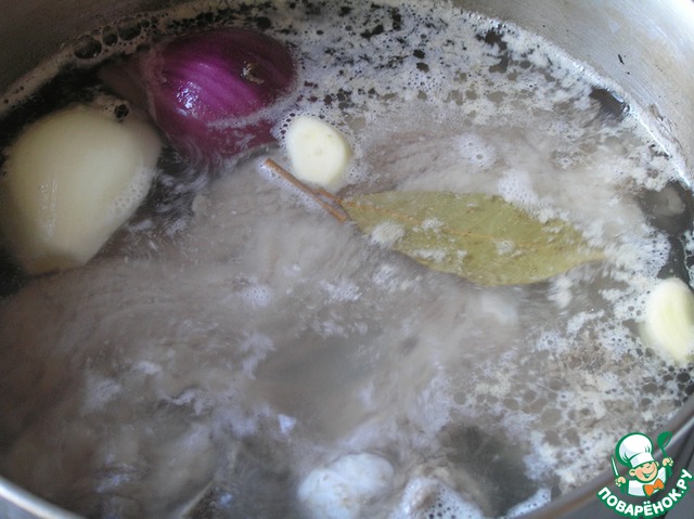 В луковицу воткнуть гвоздику, добавить в кастрюдю с лавровым листом, готовить на маленьком огне около 1,5 часов, время от времени снимая пену.