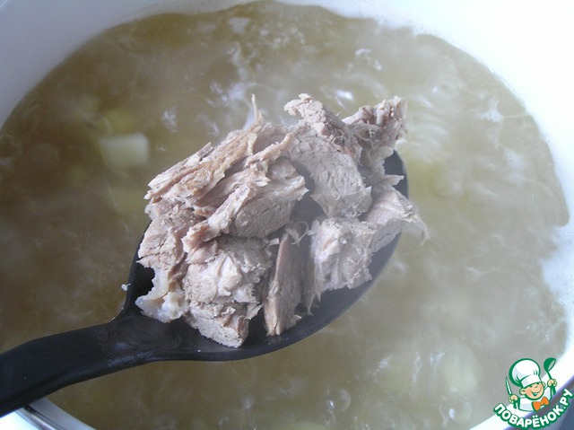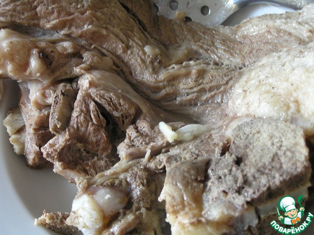 Затем мясо вынуть, освободить от кости, нарезать кусочками или разобрать на волокна.