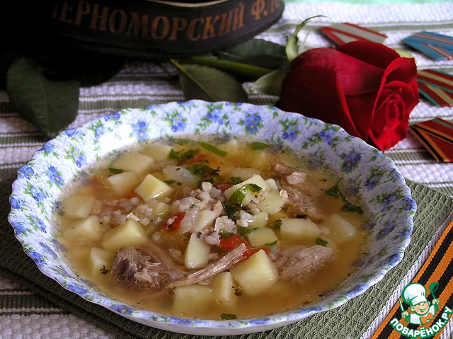 Суп из свинины с зеленой гречкой и томатами