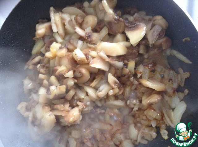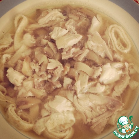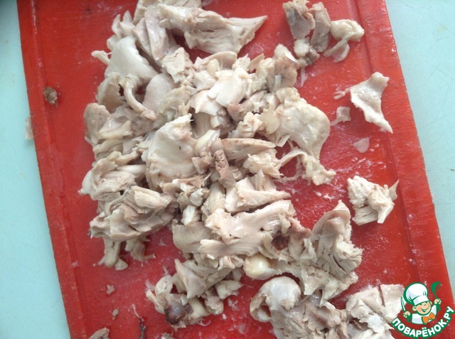 Когда курица будет готова, остужаем ее и разделываем на маленькие кусочки. Процеживаем бульон и кладем туда пережаренные грибы с луком и курицу, даем чуть-чуть постоять.