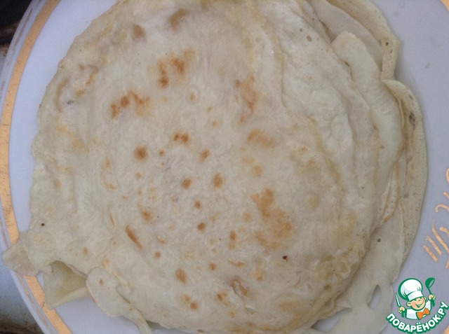 После этого жарим блинчики. Смешиваем яйцо, воду, муку. Можно вместо воды сделать блинчики на молоке, тут уже дело вкуса.