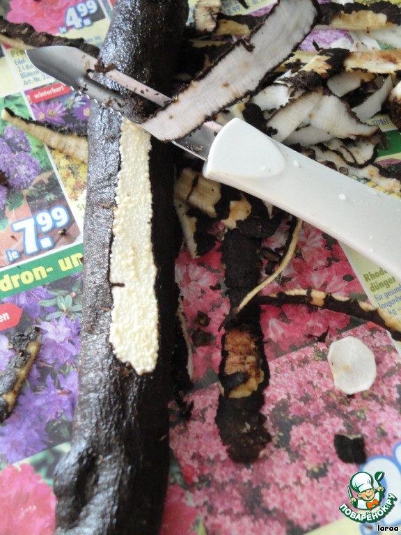 Затем очистить, принцип как у спаржы. Только стол перед этим тоже лучше застелить газетой, чтобы потом не отмывать прилипшие очистки.