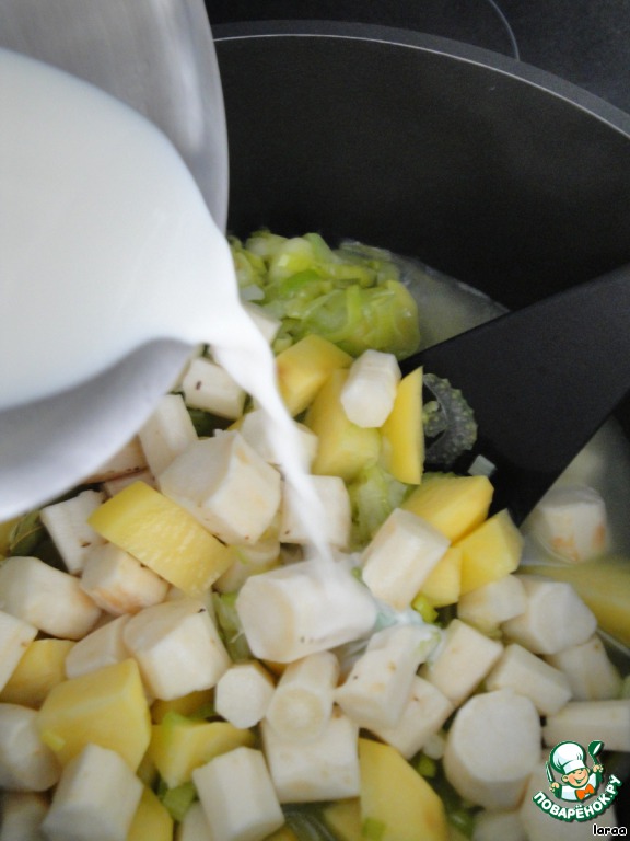 Добавить черный корень, порезанный на кусочки и залить молоком. После закипания убавить огонь и варить мин. 20, до готовности.