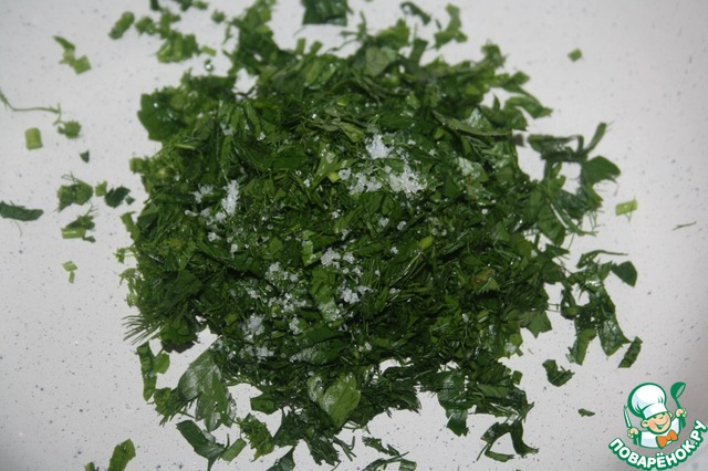 Зелень нарезать, слегка посолить.