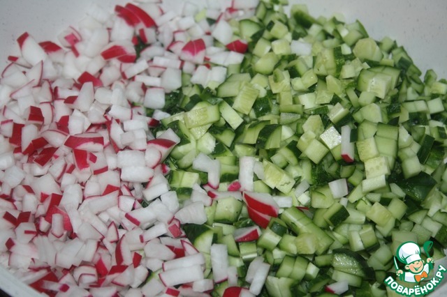 Огурцы и редис нарезать кубиком.