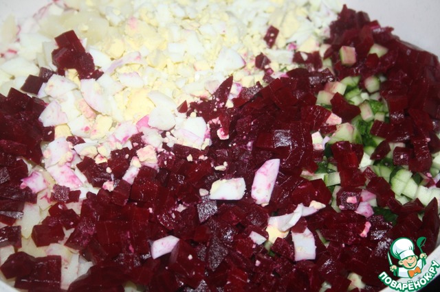 Картофель, яйца и свеклу отварить. Очистить и охладить в холодильнике.