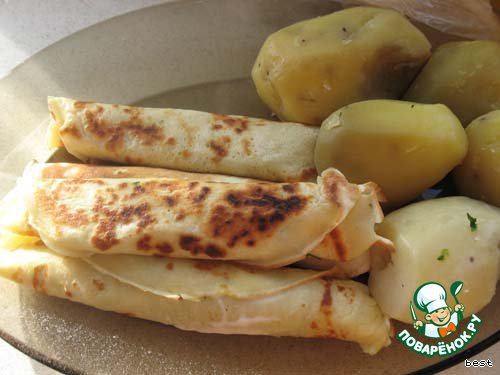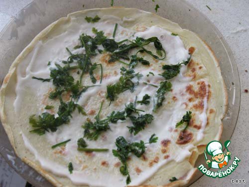 Блинчик, пока он теплый, намазать с одной стороны майонезом, посыпать зеленью и свернуть рулетиком.