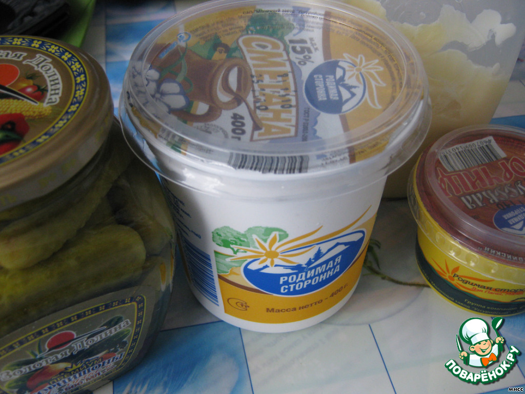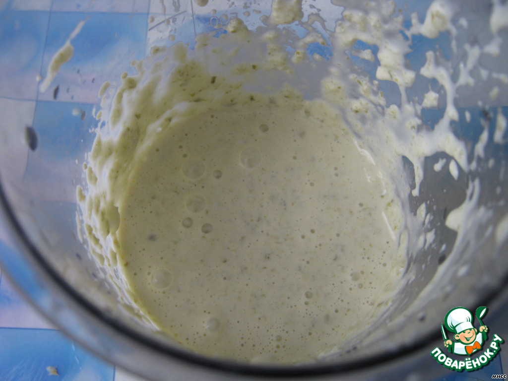 В блендер загружаем огурчики, майонез, сметану, горчицу. Огурчики измельчаем и всё перемешиваем.