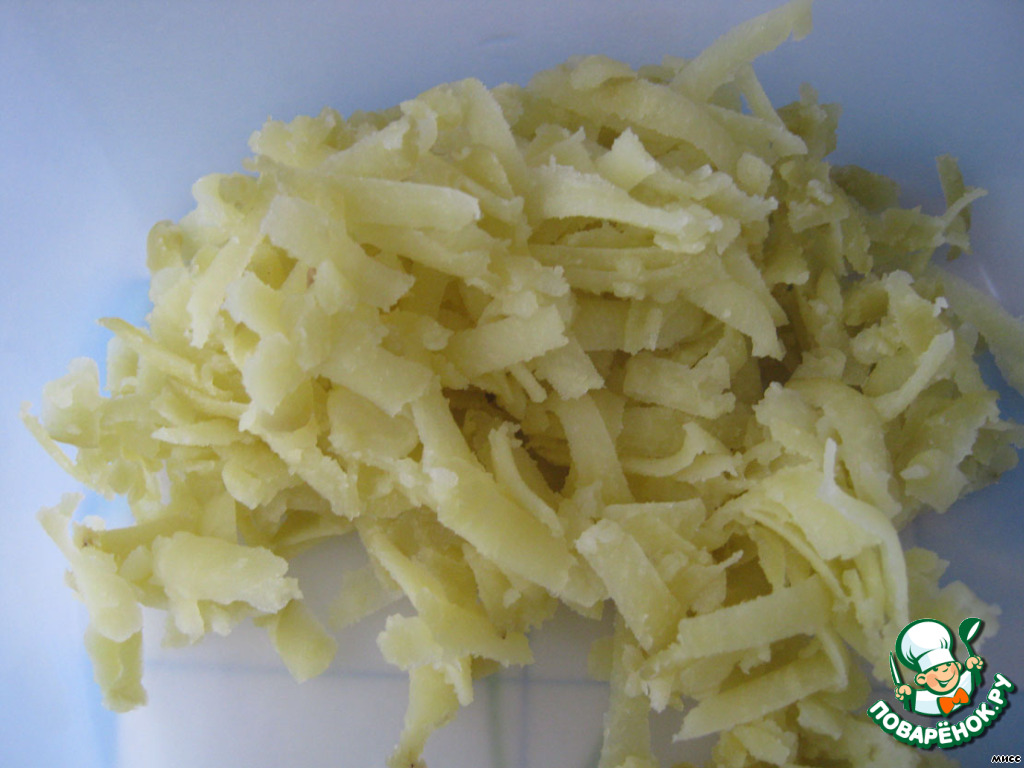 На крупной тёрке натираем сваренный в "мундирах" картофель.