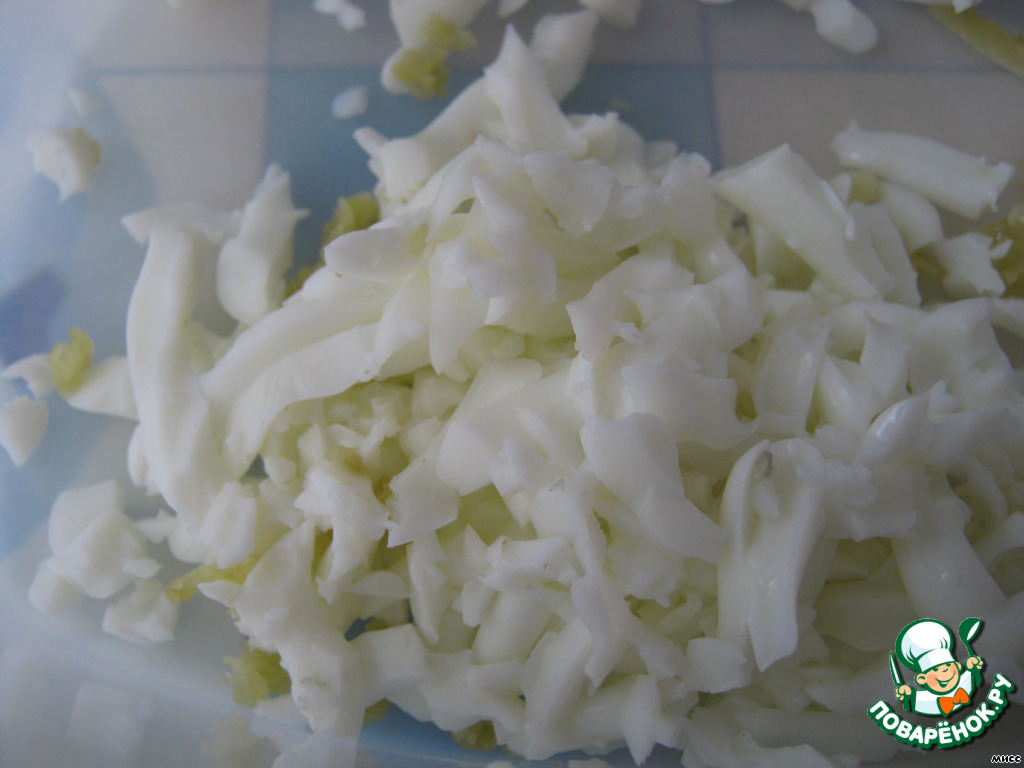 Сначала натираем на крупной тёрке белок сваренного яйца, желток откладываем.