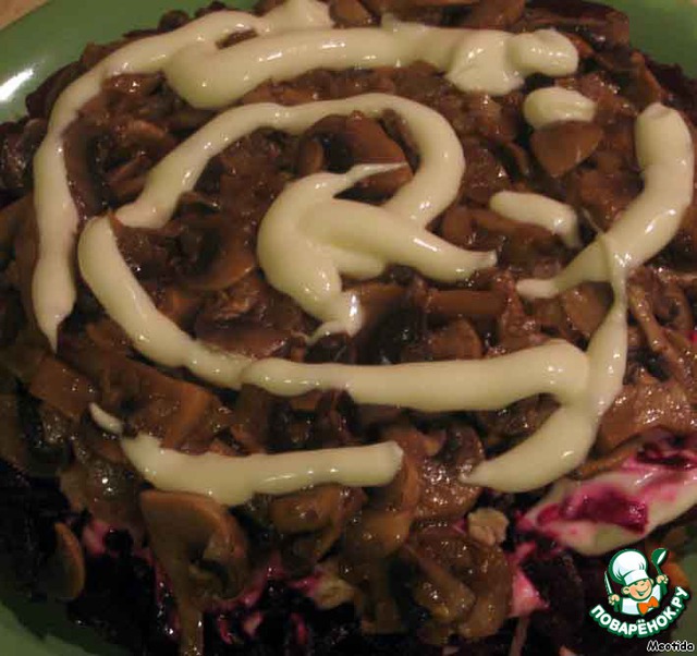 слой грибочков, покрываем слегка майонезом