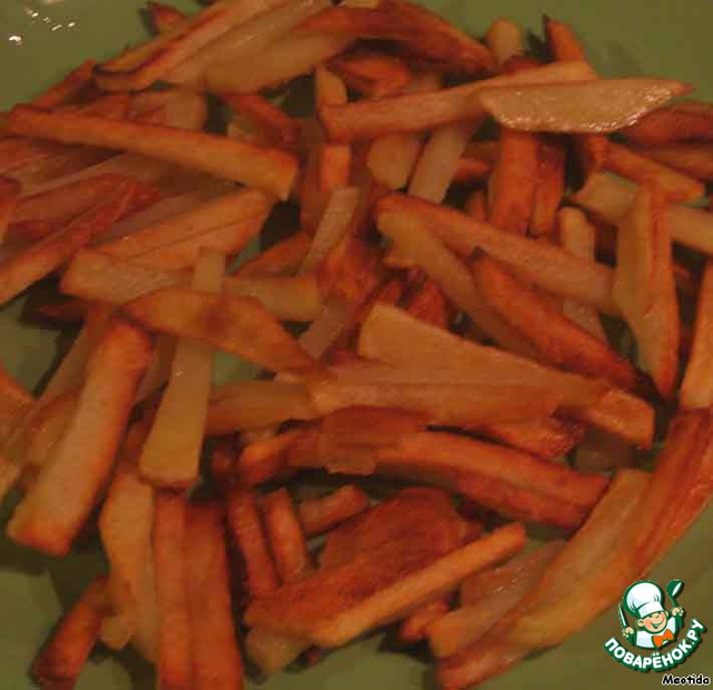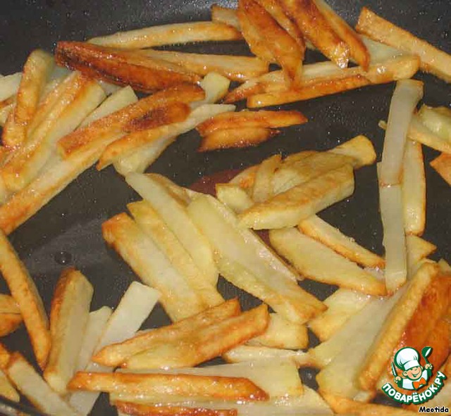 соломкой нарезаем картофель и обжариваем на раскаленной сковородке до золотистого цвета, приправляем солью и перцеп, по вкусу
