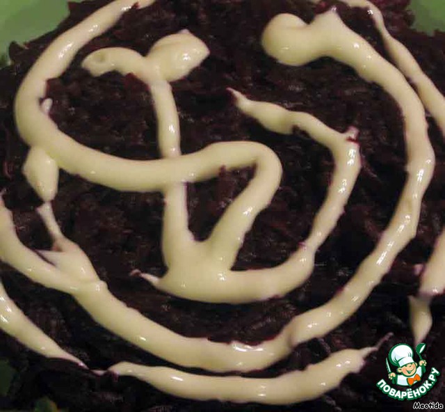 затем слой тертой на крупной терке свеклы, посыпаем измельченным чесночком и смазываем майонезом