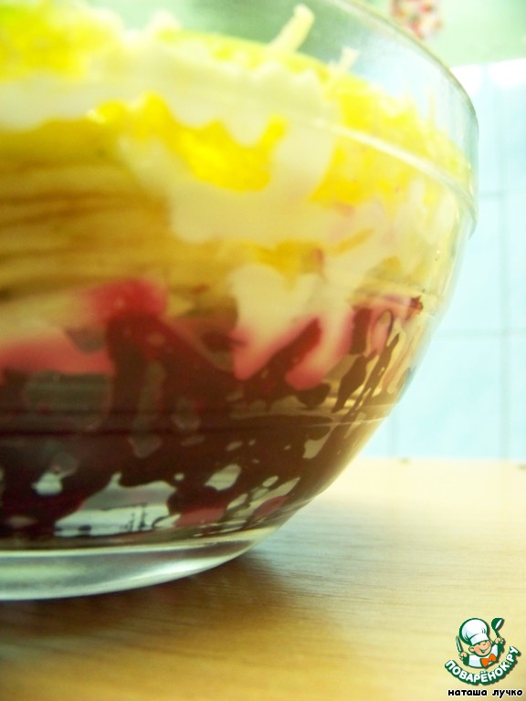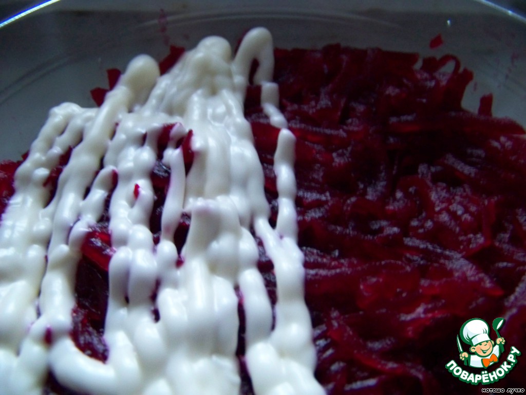 Свеклу натереть на крупной тёрке, сверху сделать "сеточку" из майонеза.