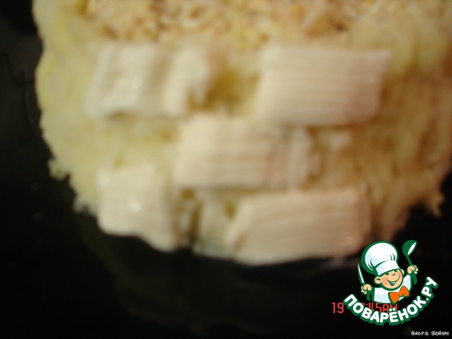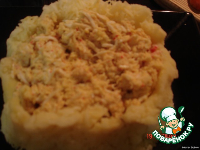 потрем картофель на терке и уложим вокруг оставшегося салатика