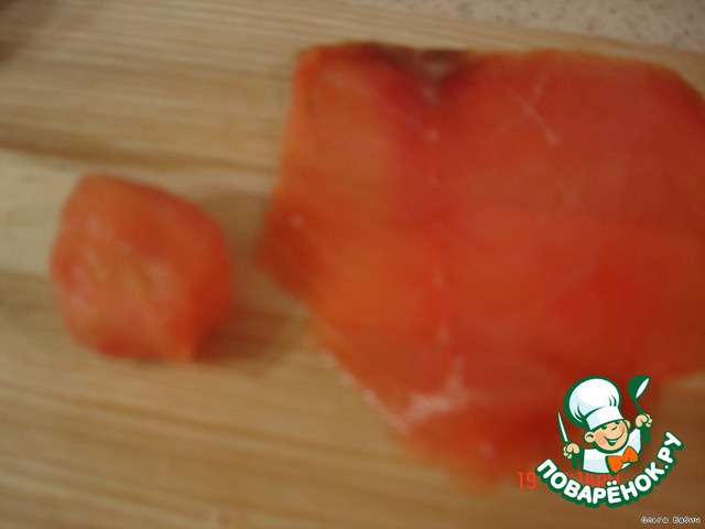 рыбку порежем на кусочки, и из полученной массы сделаем клубничку