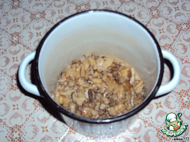 Вешенки (можно шампиньоны) слегка посолить, поперчить и обжарить на растительном масле. Остудить. Масло сцедить. Выложить грибы в глубокую форму или любую ёмкость цилиндрической формы.