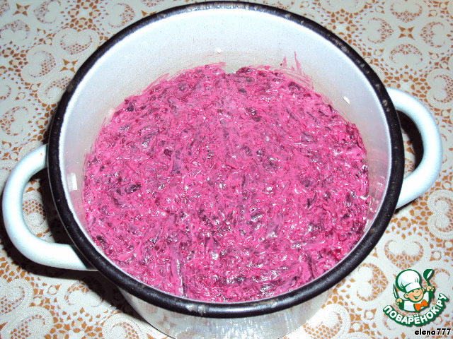 Свёклу натереть на крупной терке, добавить выдавленный чеснок, немного майонеза и перемешать. Можно чуть посолить.
