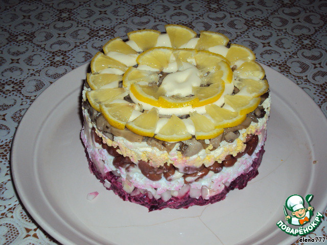 Промазываем майонезом и выкладываем дольки лимона по кругу. Вот так.