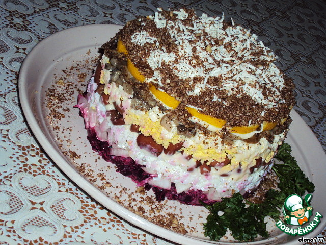 Последним слоем салата выложить свеклу с чесноком и майонезом. Каждый слой старайтесь ложкой прижимать к предыдущему, немного утрамбовывая.