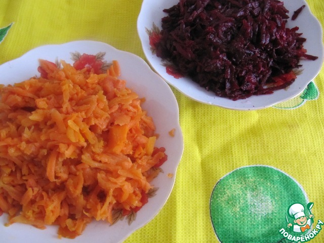 Отварите отдельно сладкую морковь и сладкую свеклу. Натрите овощи на крупной терке