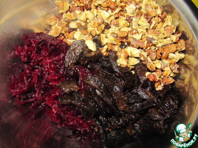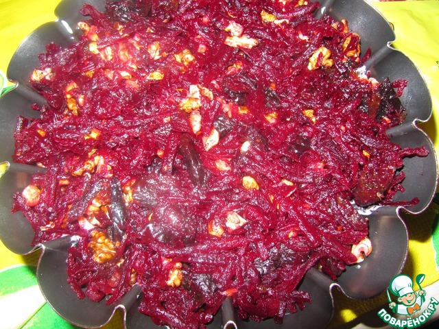 Смешайте распаренный и нарезанный соломкой чернослив с натертой свеклой. Добавьте измельченные и обжаренные грецкие орехи