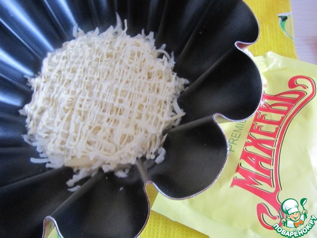 Возьмите любую красивую форму. Выложите слоями. Первый слой-сыр, полейте майонезом