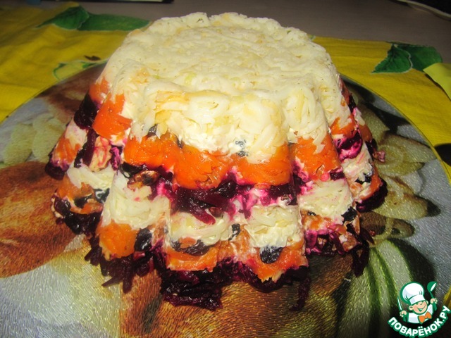 Третий слой-свекла с черносливом и орехами, полейте майонезом
