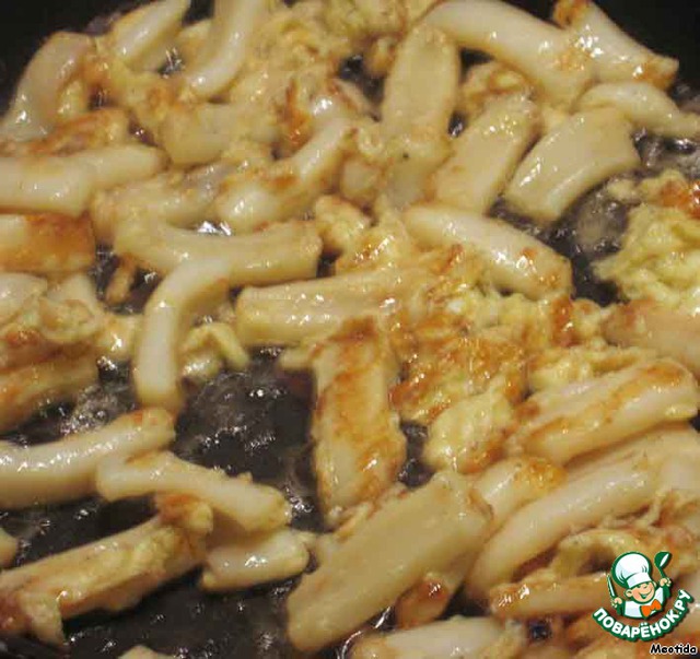 кальмар смешиваем с яично-молочной смесью и обжариваем на раскаленной сковородке с 1-2 ст.л. растительного(оливкового) масла, постоянно помешиваем (готовим пару минут, чтобы не пересушить кльмарчиков)