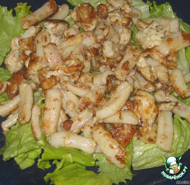 кальмар нарезаем небольшими кусочками, посыпаем солью и перцем