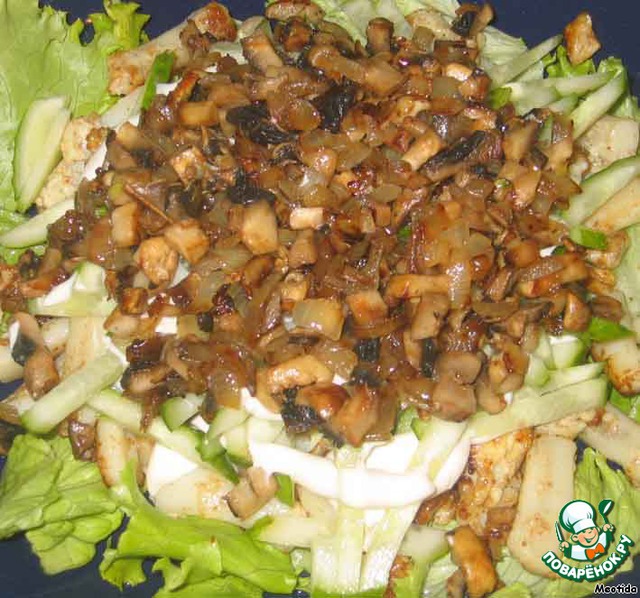 теперь слой жареных грибочков с луком, смазываем его слегка майонезом