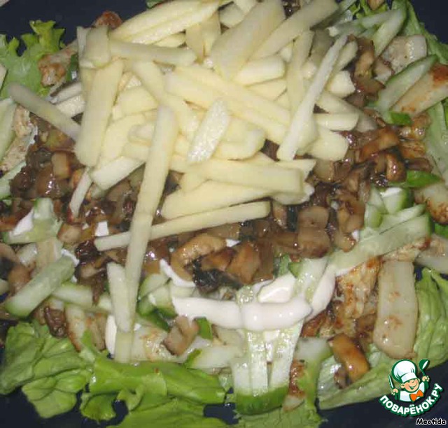 яблочко очищаем от шкурчи и семечек, нарезаем соломкой и хорошенько смачиваем лимонным соком, чтобы яблоко не потемнело, выкладываем сверху на салатик